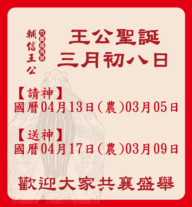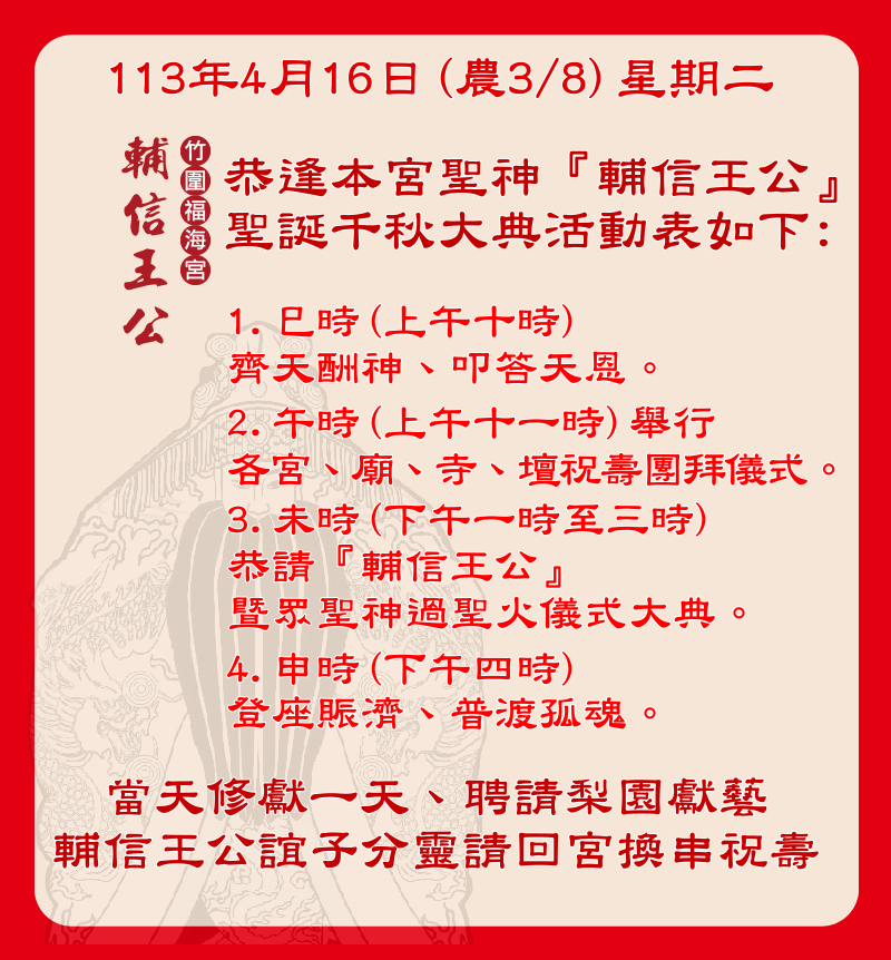 竹圍福海宮歡慶輔信王公聖誕「飛輦轎、過金火」4/16海湖福安府登場4/16上午11:15 中華航空董事長 謝世謙一行約10人左右會來團拜祝壽